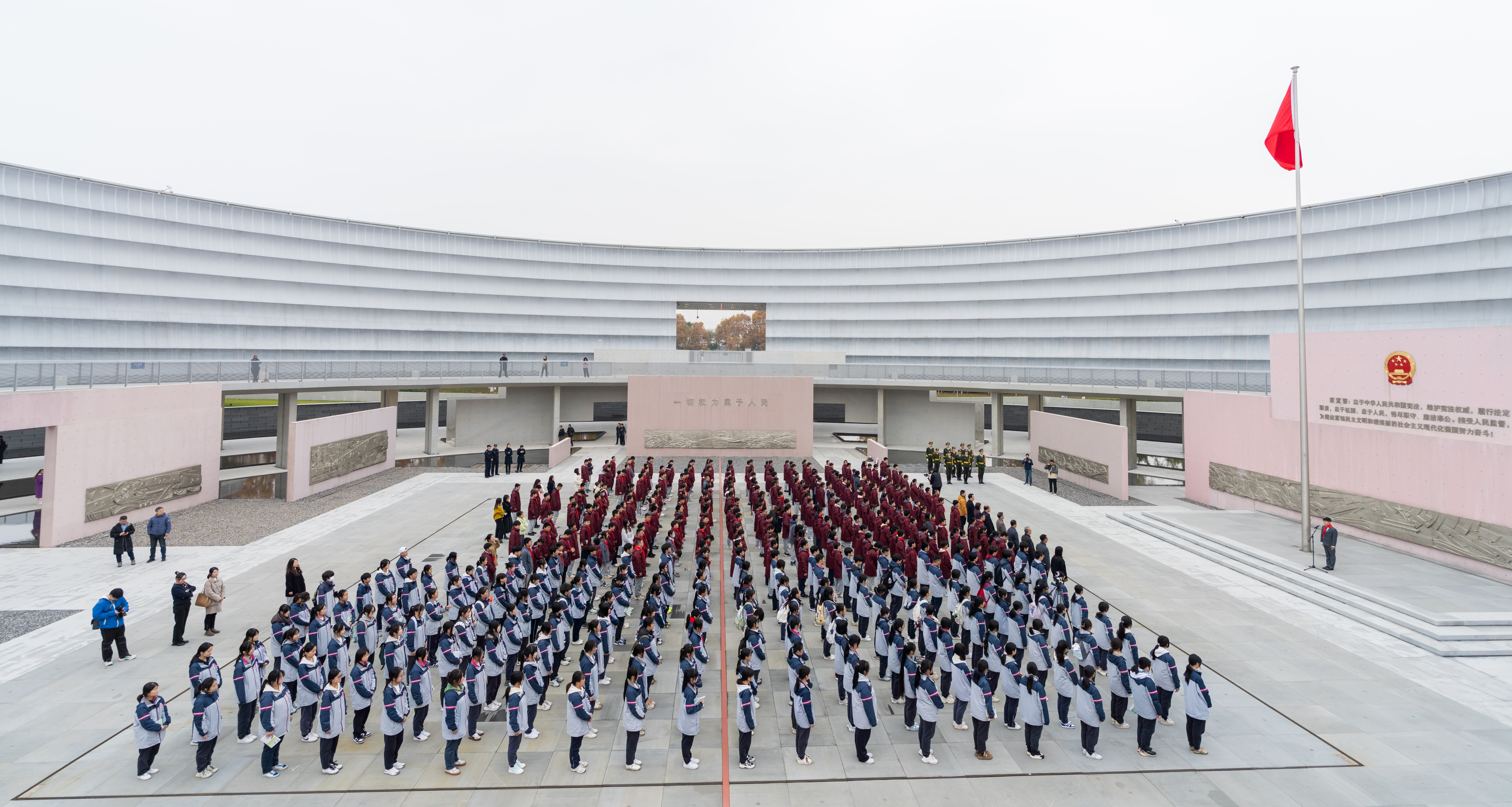 “齐步走!”14时30分,在南京宪法公园宣誓广场,随着南京市宁海中学曾联松国旗护卫队升旗手一声嘹亮的口令,“宪法主题思政课”正式开课:10名队员迈着整齐的步伐,护送鲜艳的五星红旗进入“课堂”……近千双眼睛紧紧注视着擎旗手肩上的国旗,现场一片肃静。