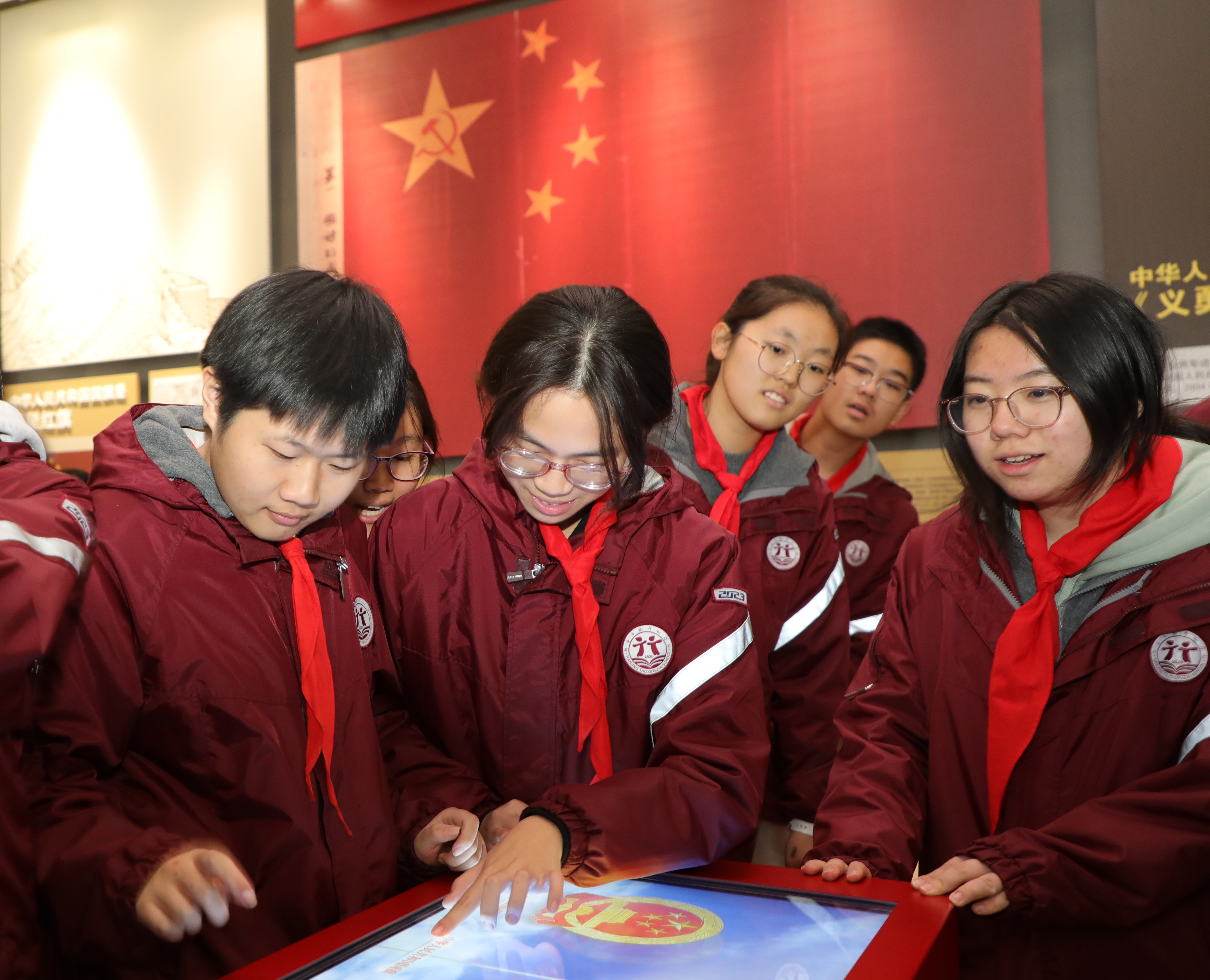 “我宣誓:忠于中华人民共和国宪法,维护宪法权威……”宪法宣传教育展“奉宪”部分宪法宣誓模拟体验台上,在宪法知识答题机对抗挑战中获胜的一组同学面对国徽,庄严地举起右拳,模拟体验宪法宣誓仪式。