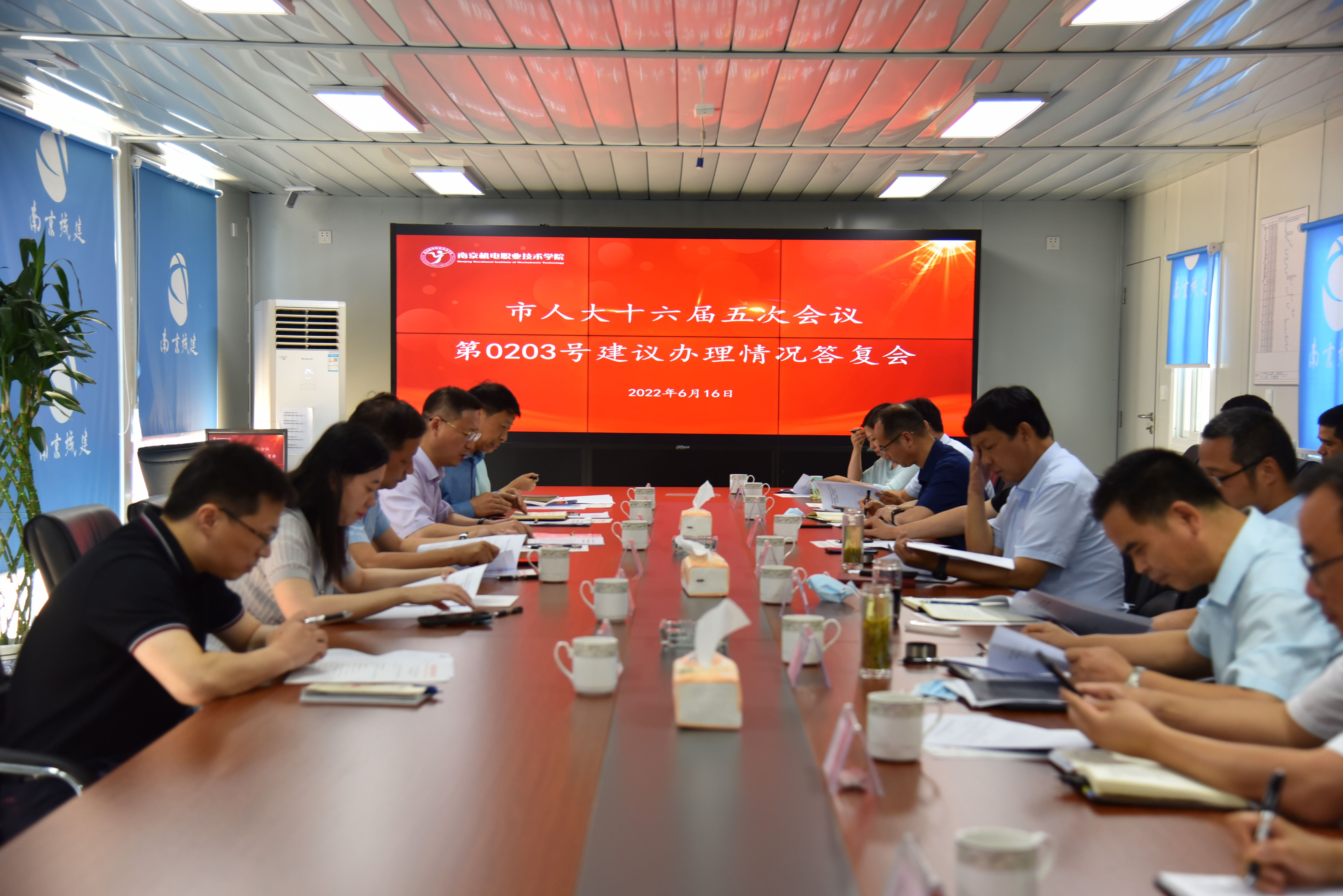 6月16日上午,市教育局潘东标副局长牵头在南京机电职业技术学院组织召开《关于加快机电学院转隶,更好地发挥其示范引领作用的建议》办理情况答复见面会。市人大代表、高淳区人大常委会主任、党组书记赵火平,市编办、教育局、财政局、人社局,区编办、教育局、财政局、人社局、南京高职园以及机电学院等单位相关负责同志参加会议。