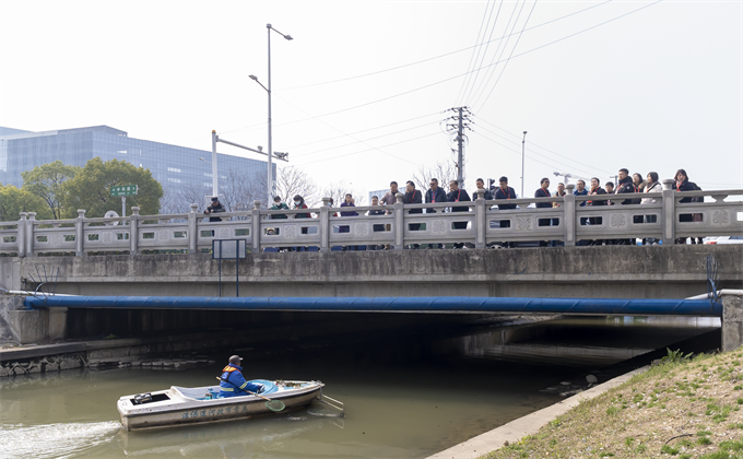 代表一行首先来到秦淮新河,在此巡河社区河长牛俊平向代表们介绍河道生态环境保护情况。近几年,通过河道治理、生态修复与人文建设,现秦淮新河已旧貌换新颜,建成了景色宜人、具有休闲、娱乐、健身多功能绿色水岸。