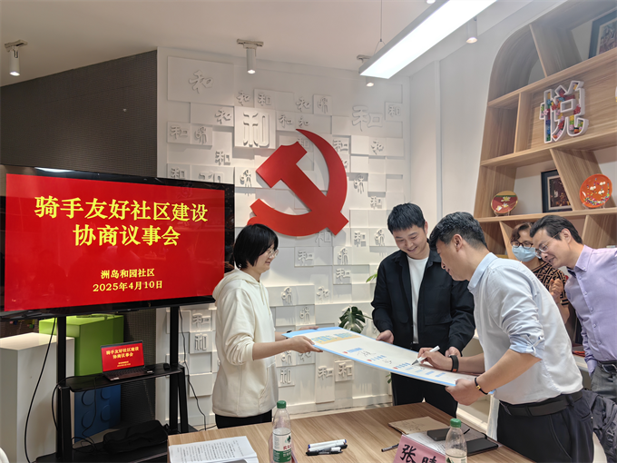 洲岛和园社区围绕加强对新就业群体的思想引导和服务提升,开展“骑手友好社区建设”协商议事会,邀请了辖区人大代表、议政代表、物业负责人以及饿了么、美团等平台的骑手代表参加。大家参观了相关服务点位和设施情况,针对更好保障骑手的“衣食住行”、权益维护、劳动安全、身心健康等情况进行了深入探讨,力求全面掌握“小哥”们缺什么、想什么、要什么。区人大代表张晴、韩云飞、焦丽等除了提出意见建议,还现场认领骑手“微心愿”,以实际行动促进“骑手友好”社区建设。
