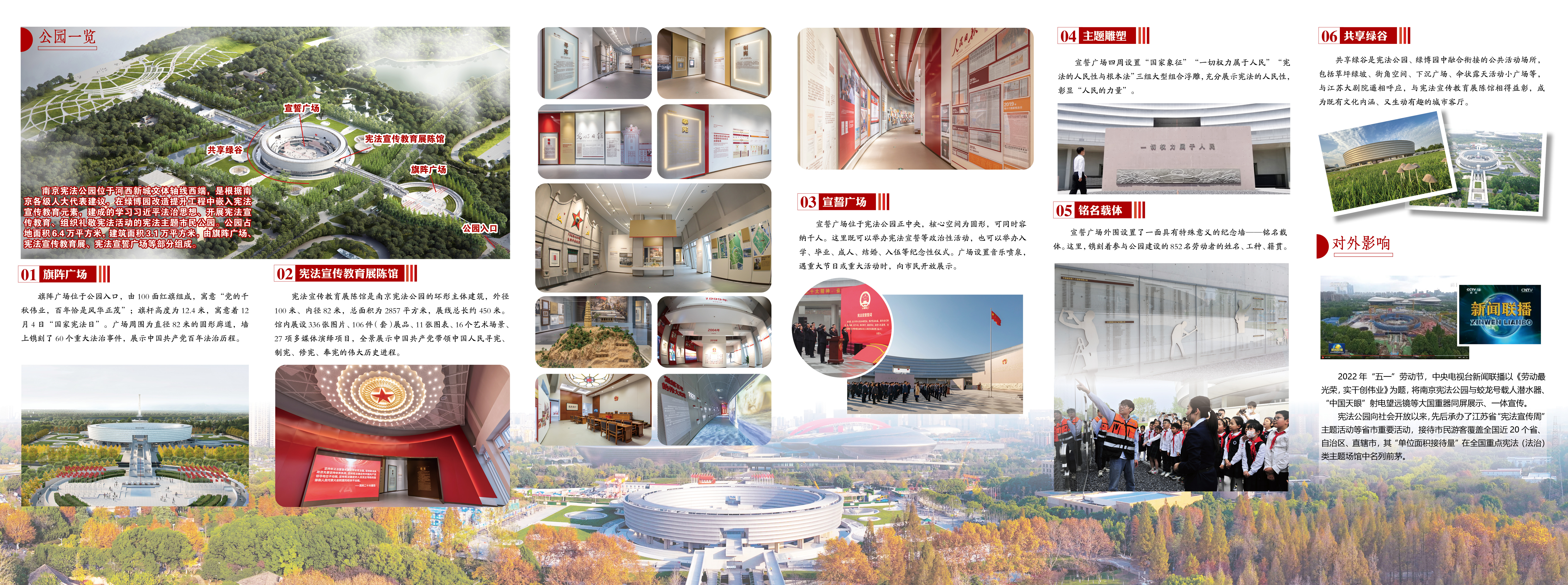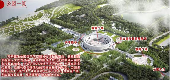 值现行宪法公布实施40周年之际,以党的二十大精神为指导、全景展示中国共产党带领中国人民寻宪、制宪、修宪、奉宪伟大历史进程的宪法主题公园——南京宪法公园历经一年紧张有序建设,于2022年12月4日建成开放。南京宪法公园位于滨江风光带与城市文体轴交汇处,滨江而立,是根据市人大代表的建议,为了弘扬宪法精神,维护宪法权威,在河西文体轴线西端改造提升工程中有机嵌入宪法宣传教育元素的方式而建成的宪法主题公园。