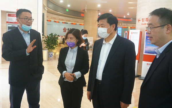 4月16日下午,市人大常委会党组副书记、副主任孙建友来到了位于中山路的南京银行总部,看望联系的市人大代表、南京银行行长林静然,并调研南京银行金融支持复工企业情况。市人大常委会副秘书长张挚、市人大监察和司法委员会副主任委员陈健陪同调研。